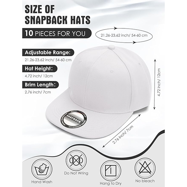 Customizable and great for Group Orders: With a hip hop style sleek design, these blank snapback hats are perfect for custom embroidery and printing. The flat bill offers a large surface for logos, team names, or unique designs. The pack of 10 hats provides an affordable option for groups, events, businesses, or teams looking to create personalized, branded headwear.