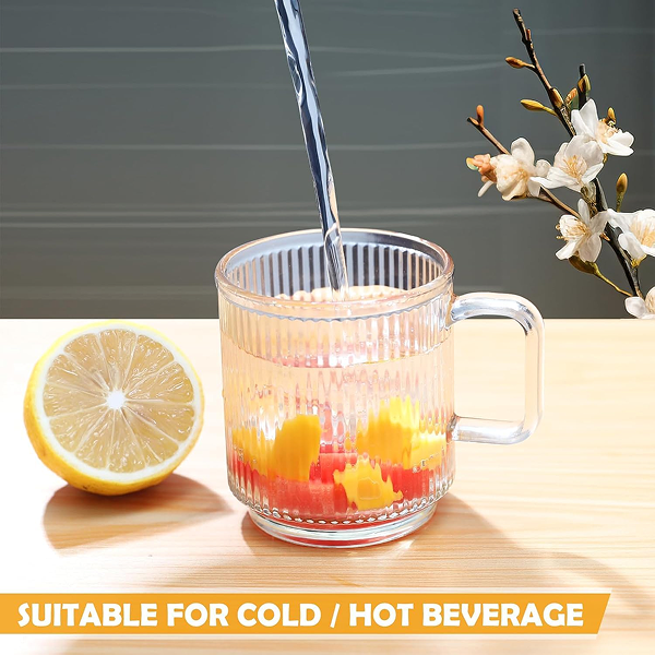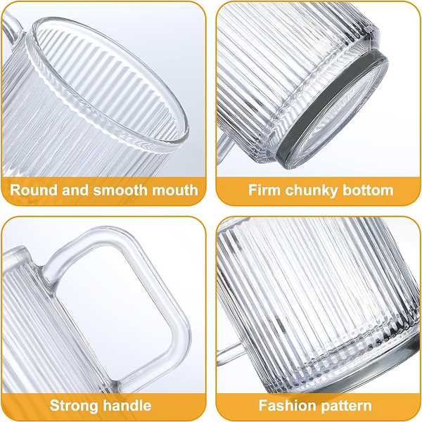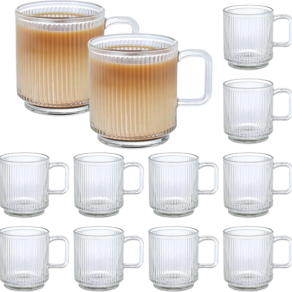 【Super Value Exquisite Set】Our glass coffee mugs set includes 12 pieces 12oz transparent classic vertical stripes glass coffee mugs with handles, which can meet daily home or office drinking needs. The exquisite appearance design makes it not only a coffee cup, but also a exquisite craft decoration on the desktop