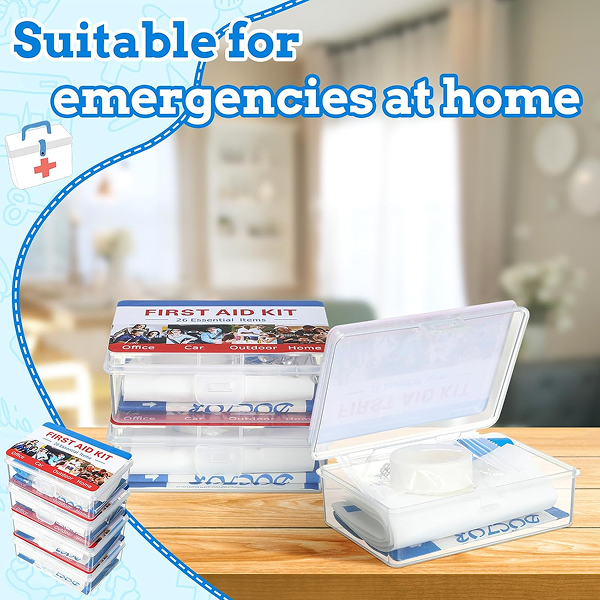 Compact and Lightweight Design: filled with essential safety supplies, our first aid kit comes in a practical 3.9 x 2.7 x 1.3 inch plastic box; There are 12 sets of mini first aid boxes, each set includes 26 pcs basic first aid items, in addition, there are 12 first aid stickers; you can choose the decoration