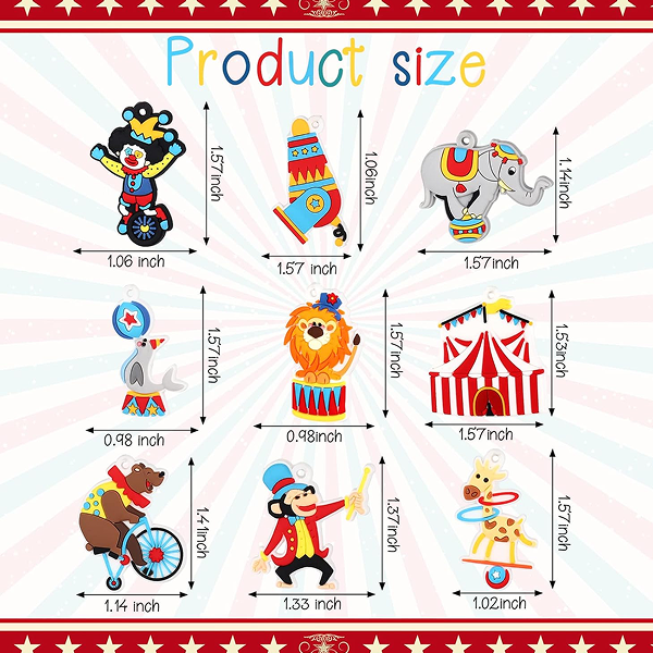 Circus Carnival Patterns: there are 9 different circus element keychains, like elephant, giraffe, monkey, clown, lion, and more, rich patterns, bright colors, you can choose different to match your bags, items, which will be stylish decorations