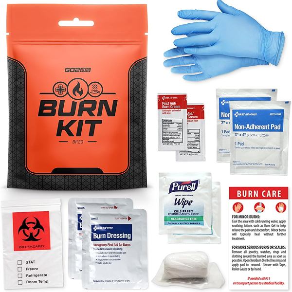 CONTAINS ALL THE ESSENTIALS: Each emergency kit contains 2 4”x4” burn dressings, 2 burn cream packets (0.9g), 1 2” gauze roll, 1 disposal bag, 2 3”x4” non-stick pads, 1 burn instruction sheet, 2 cleansing wipes, and 1 pair of nitrile gloves.