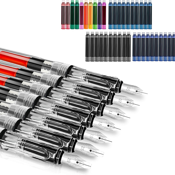 Versatile Set: Calligraphy pen set contains 7 fountain pens with different nib widths (0.5 mm, 0.7 mm, 1.1 mm, 1.5 mm, 1.9 mm, 2.5 mm, 2.9 mm) and 40 ink cartridges in 11 colours, fit for various font styles, and meets your writing and drawing needs