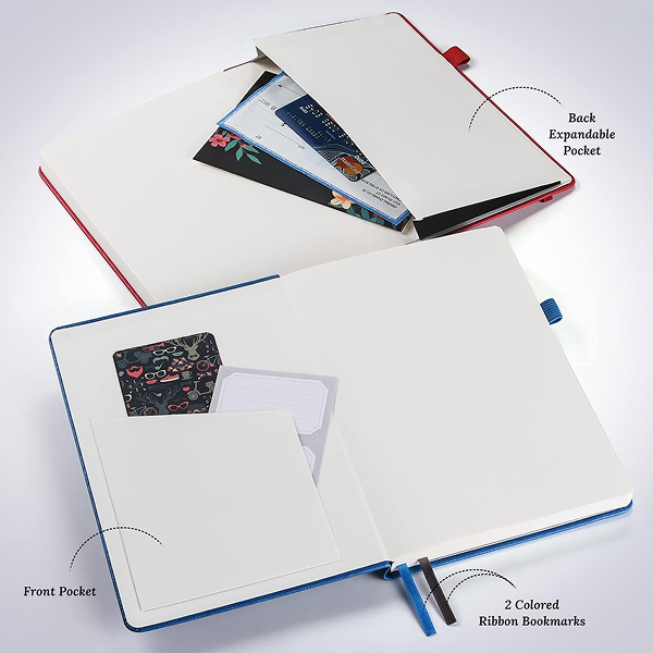 Dotted Journals: 5.7 inches x 8.3 inches, suitable for a handbag, purse, or bookbag to take around with you. Each journal has 2 inner pockets, 2 sticker labels, 2 colored ribbon bookmarks & an elastic closure band, and a pen holder for an organized writing experience.