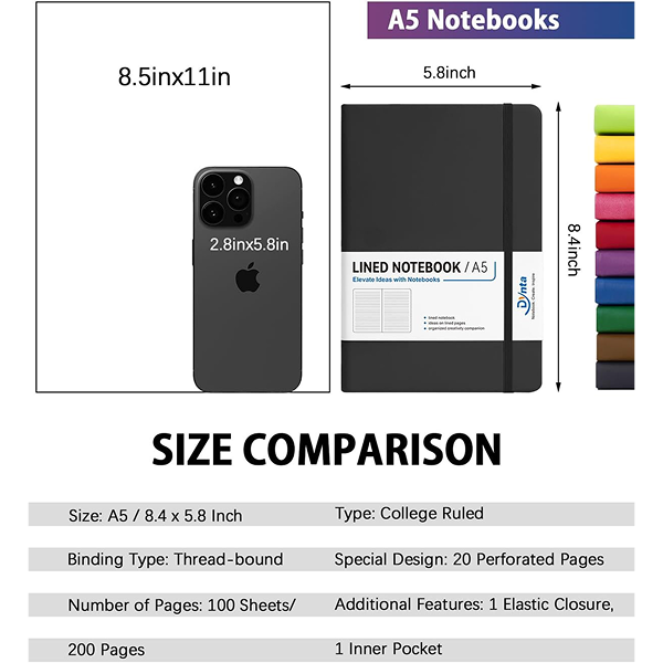 Perfect size: 8.4 “x 5.8″classic ruled lined notebook features a durable and soft hand feel PU leather cover, 100sheets, 200 pages
