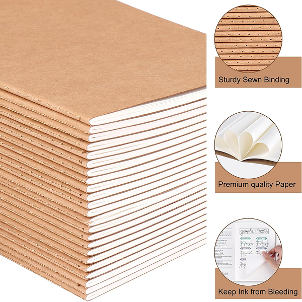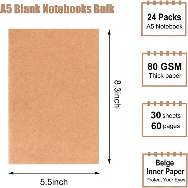Notebook set includes: 24 A5 kraft blank notebooks, each 30 sheets (60 pages) of high-quality writing paper. These notebooks are perfect for note-taking, sketchbook, and carrying along during travel.