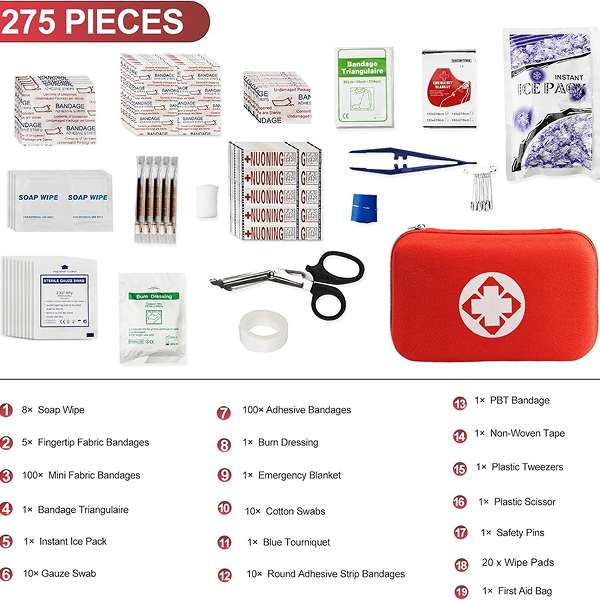 📣 Practical Emergency Kit: This is a emergency survival kit, it contains various practical first aid gear. There are adhesive strip bandages, gauze swab, cotton swab, bandage triangulaire, emergency blanket, instant ice pack, burn dressing, blue tourniquet, PBT bandage, plastic tweezers, safety pins, plastic scissors.