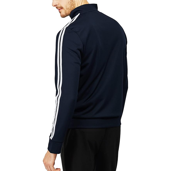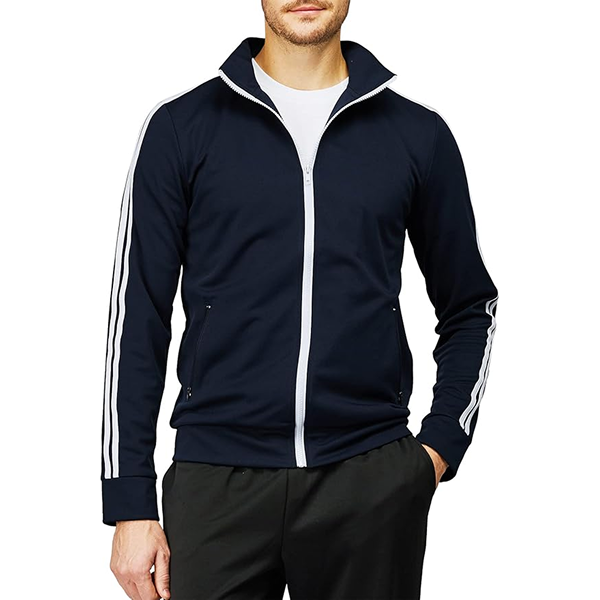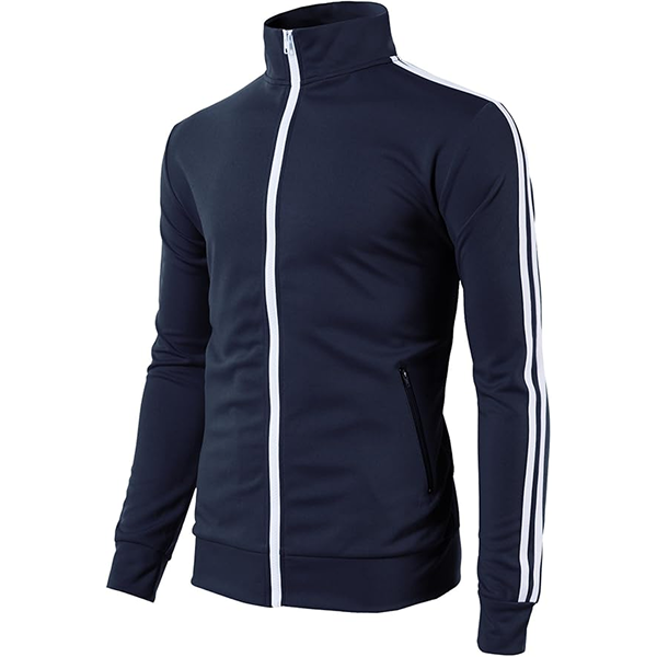 Features ; Two Stripes on sleeves, Elastic cuffs and hem, and Two side Zipped pockets Full zip closure Slim Fit Track Jacket with stand-up collar.