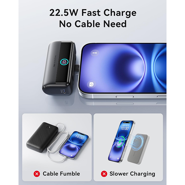 22.5W Fast Charge, No Cable Needed: With 22.5W fast charging, power up your devices on the go in a flash, freeing you from tangled cords vs original wired power bank and slow speeds vs wireless power bank.