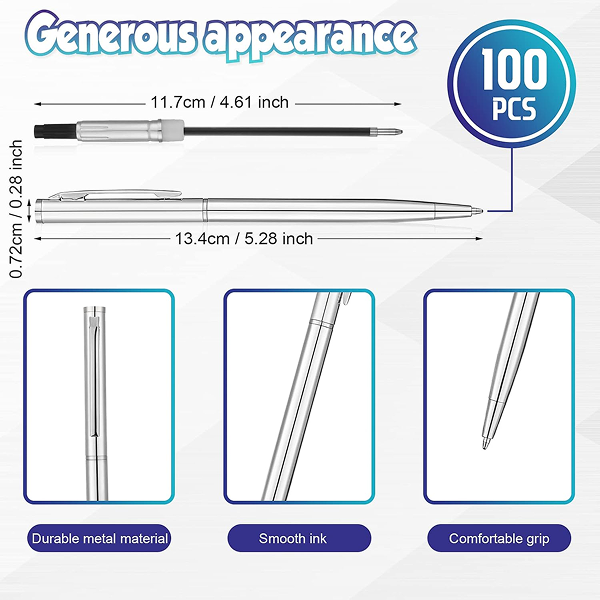 Rich in Quantity: you will receive 100 pieces of slim metallic ballpoint pens in silver color, looking simple and elegant; The abundant quantity can satisfy your use and replacement requirements in daily life, and you can share them with friends