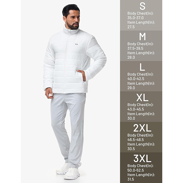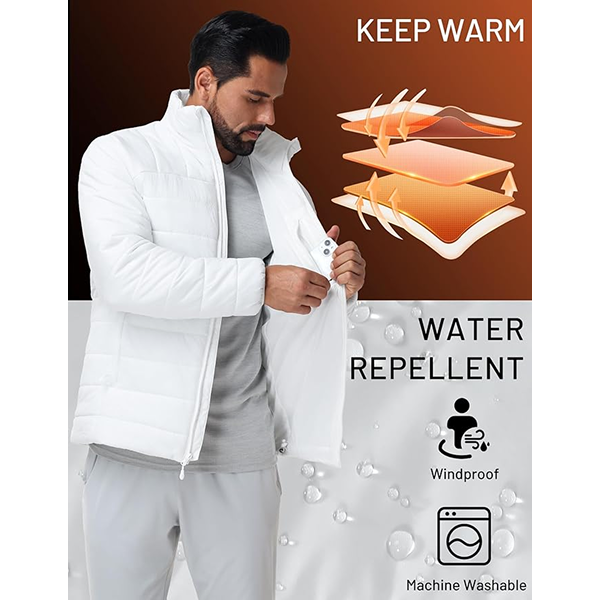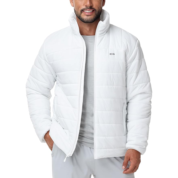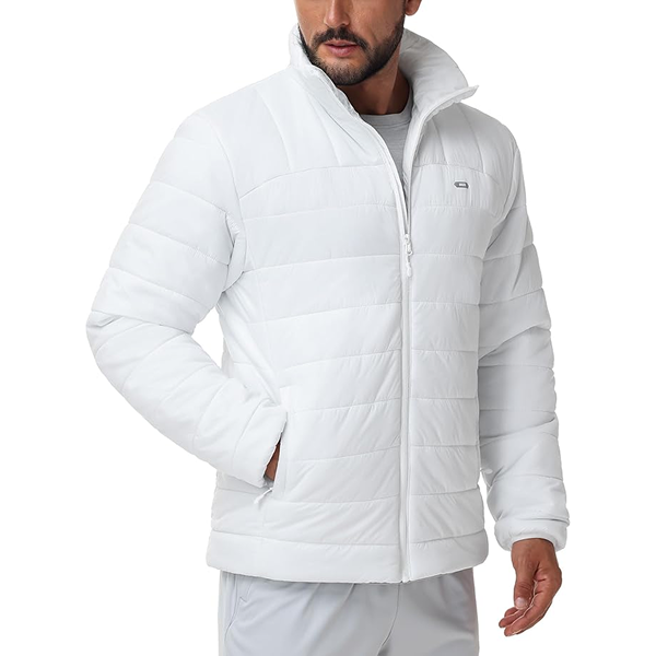 Packable Men’s Puffer Jacket: This light weight down-alternative jacket comes with a drawstring storage bag. It can be easily packed into the compact bag, allowing you to conveniently hang it from a backpack or store it in a suitcase