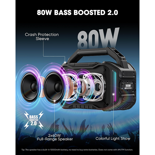 ULTIMATE LISTENING EXPERIENCE: The outdoor loud bluetooth speaker is equipped with an 80W peak power speaker, two reinforced speaker magnets, two diaphragms, and Deep Bass technology. Improves the crisper sound quality of speakers. Capable of penetrating most ambient noise, allowing you to enjoy a vivid, powerful, natural, and authentic auditory experience even in noisy environments.Great for music audiophile!